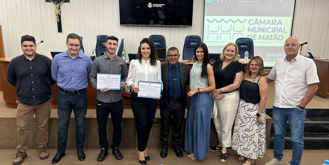 A infraestrutura urbana e a prestação de serviços essenciais pautaram o Primeiro Expediente da sessão legislativa do dia 30 de março da Câmara de Vereadores de Matão. Presidida pelo vereador China Calabrês, os colaboradores da Águas de Matão, Guilherme Cyrino e Larissa Pizanelli foram homenageados em iniciativa apresentada pelo vereador Policial Carmo, que ressaltou a dedicação e o comprometimento técnico de ambos no exercício de suas funções, destacando ainda que, como jovens, os dois profissionais servem de exemplo de atuação para a juventude do município.